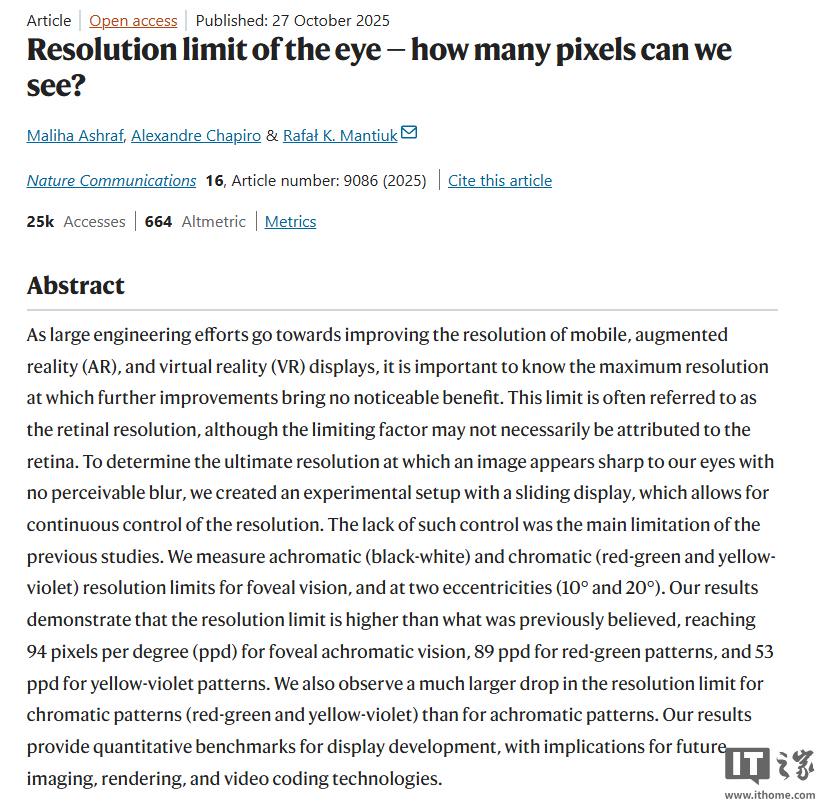 总而言之,这项研究表明,人眼在理想条件下的可分辨像素密度可能远高于传统假定的 60 ppd,且随着视角偏离,衰减幅度与色彩通道有关。对显示器以及未来沉浸式视觉设备而言,这是一个重要的校准尺度,有助于在“看不出差别”之前停止无谓的硬件升级,从而更聪明地做设计与配置取舍。